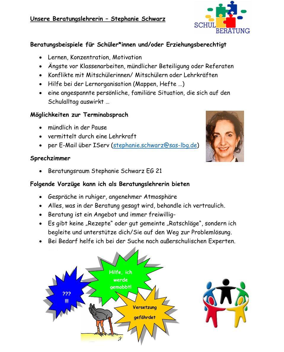 Beratung ist ein alltäglicher Bestandteil unseres Schullebens und wird den Beteiligten meist gar nicht als Beratung bewusst. Grundsätzlich wird ein vertrauensvoller Umgang zwischen Schülern, Eltern und Lehrern angestrebt, so dass ein gutes Schulklima entsteht. Mit meiner Beratungstätigkeit möchte ich dazu beitragen.