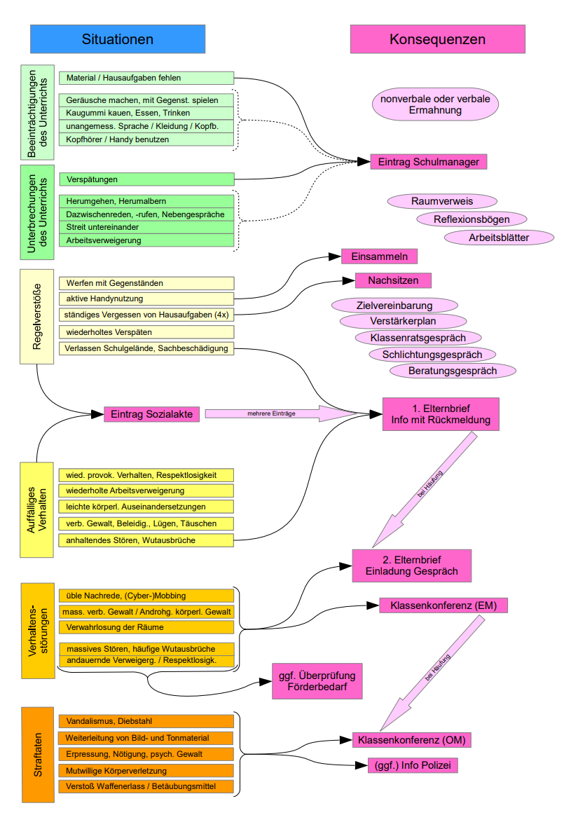 Der Umgang mit Regelverstößen und den sich daraus ergebenden Konsequenzen ist (leider) ein wichtiger Bestandteil des Schullebens. Regelverstöße müssen natürlich geahndet werden. Dies soll aber fair und für alle transparent geschehen. Daher hat das Kollegium gemeinsam ein Konzept erarbeitet, nachdem wir alle gemeinsam vorgehen und so unsere Schule zu einem Ort machen, an dem jeder sich sicher und gerecht behandelt fühlen kann.