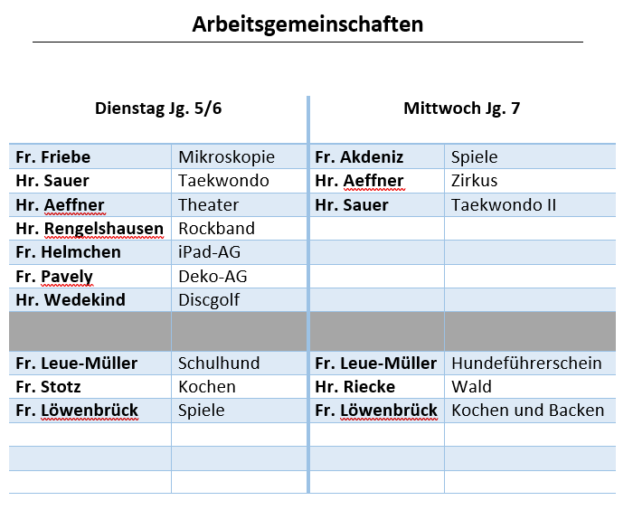 - Die Arbeitsgemeinschaften finden dienstags (Jg. 5 und 6) und mittwochs (Jg. 7) in der Zeit von 14.10 Uhr bis 15.40 Uhr statt.